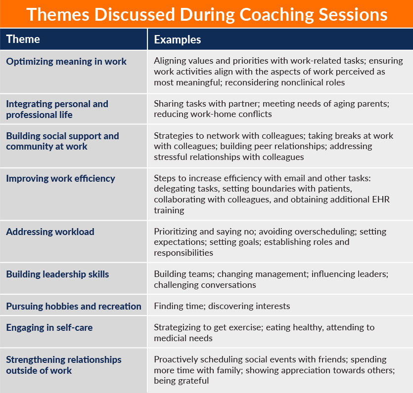 Some of the best data on the topic came out of a JAMA article in 2019 about the effects of physician life coaching on burnout. The study took 88 internists, family physicians, and pediatricians and put 44 of them randomly into the “coaching group” who received 3 1/2 hours of coaching over six months. They were allowed to get coaching on whatever they wanted. This is what they discussed: